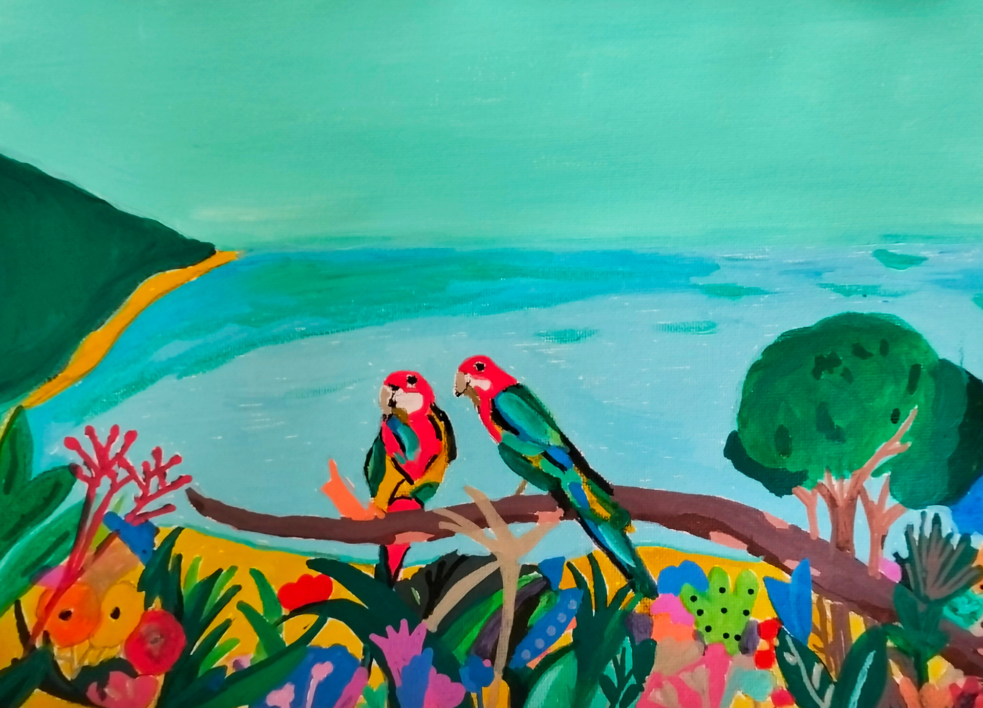 Acrylic original painting on canvas. Needs to be stretched or placed in a frame. A beautiful and colourful acrylic pen painting of our beautiful Australian birds, features two Rosella's on a branch high in a hill surrounded by beautiful foliage Artwork Details Medium Acrylic, Canvas, Ready to hang Dimensions 29cm (W) x 21cm (H) x 0.1cm (D)